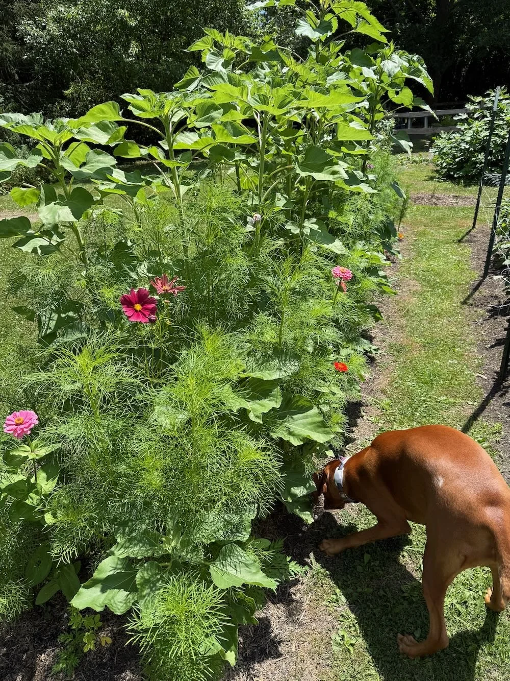 Here is our rabbit monitor on duty trying to flush out the voracious critters. Luckily rabbits don’t seem to like cosmos or sunflowers. However the rabbit monitor does like to take a secret nibble from the zinnia leaves.