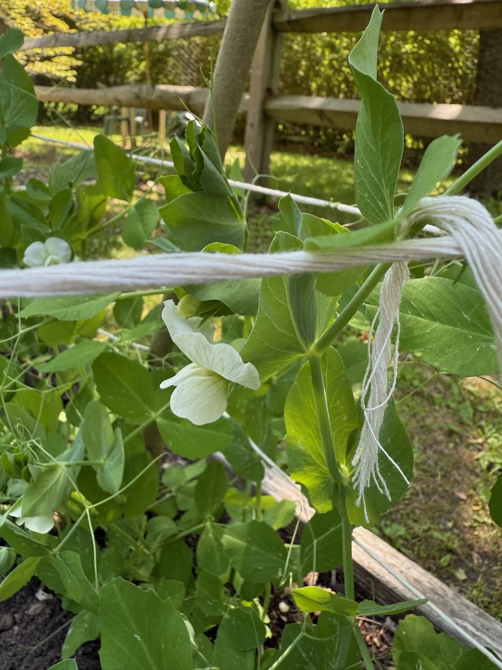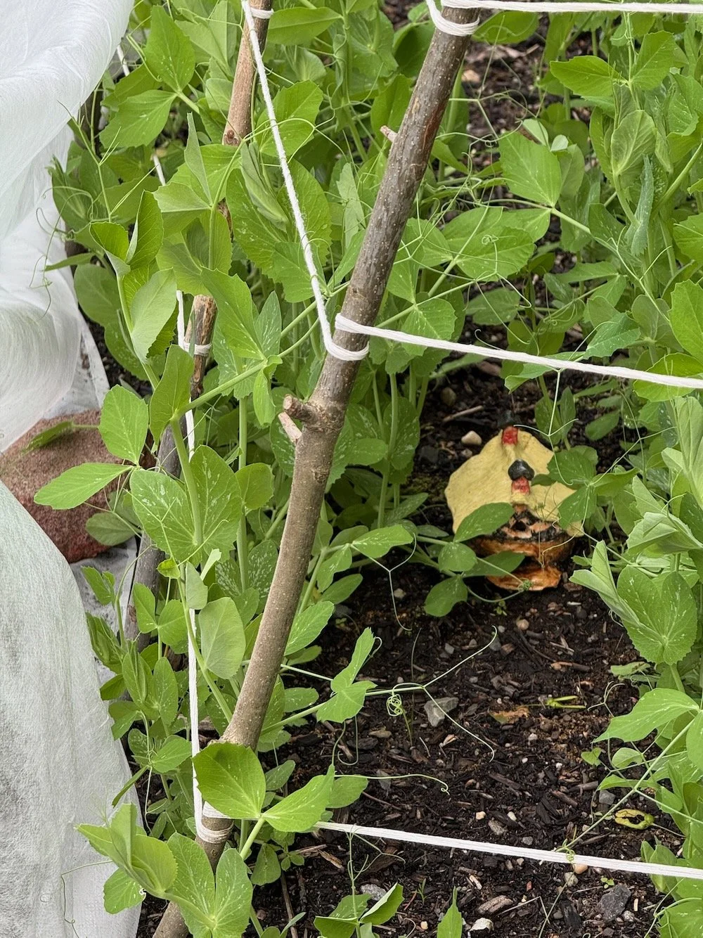 Now we have gone straight in to summer with temps in the high 80s. The snap peas are growing fast. I added two more levels of supporting string to the pea fence and it seemed like overnight the vines were already reaching for the top level. The ceramic fairy house will soon be in complete shade and hidden, just the way the garden fairies like it!