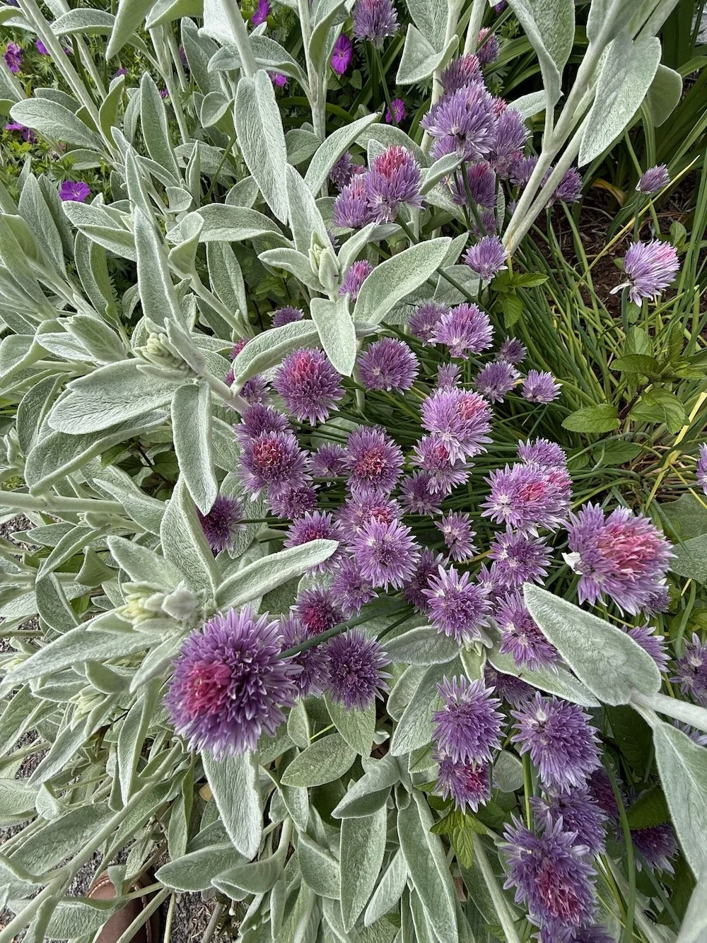 It is now garlic chive flower and herbaceous peony season in the garden. We use the garlic chives in our Scrambled Eggs with Goat Cheese and Chives breakfast special, but they are also wonderful cut flowers and a great in the gardens because critters don’t eat them. This photo is from the Carriage House border where the chives are paired with the fuzzy softness of Lamb’s Ear (Stachys byzantina) that will also bloom with tiny lavender colored flowers.