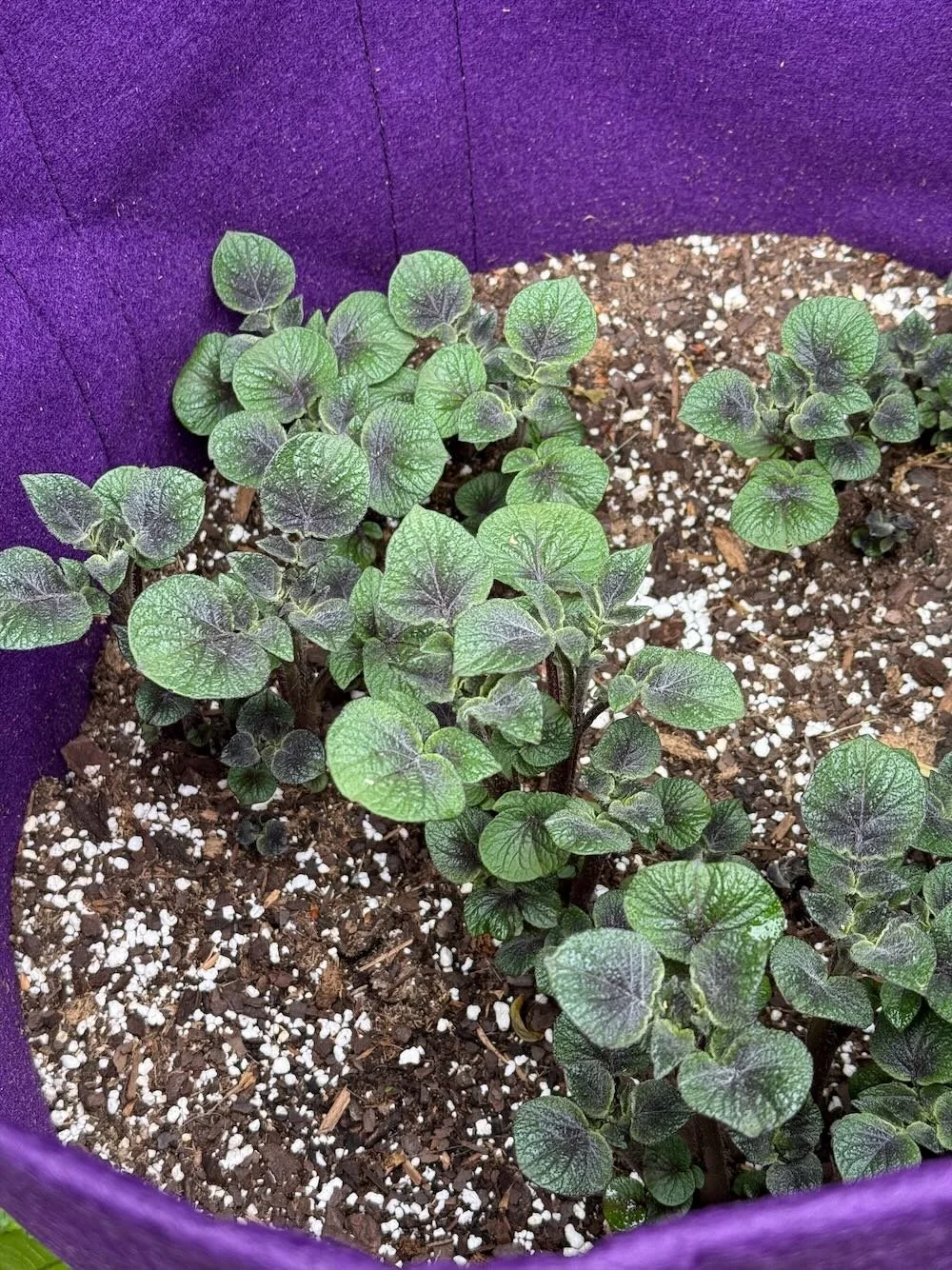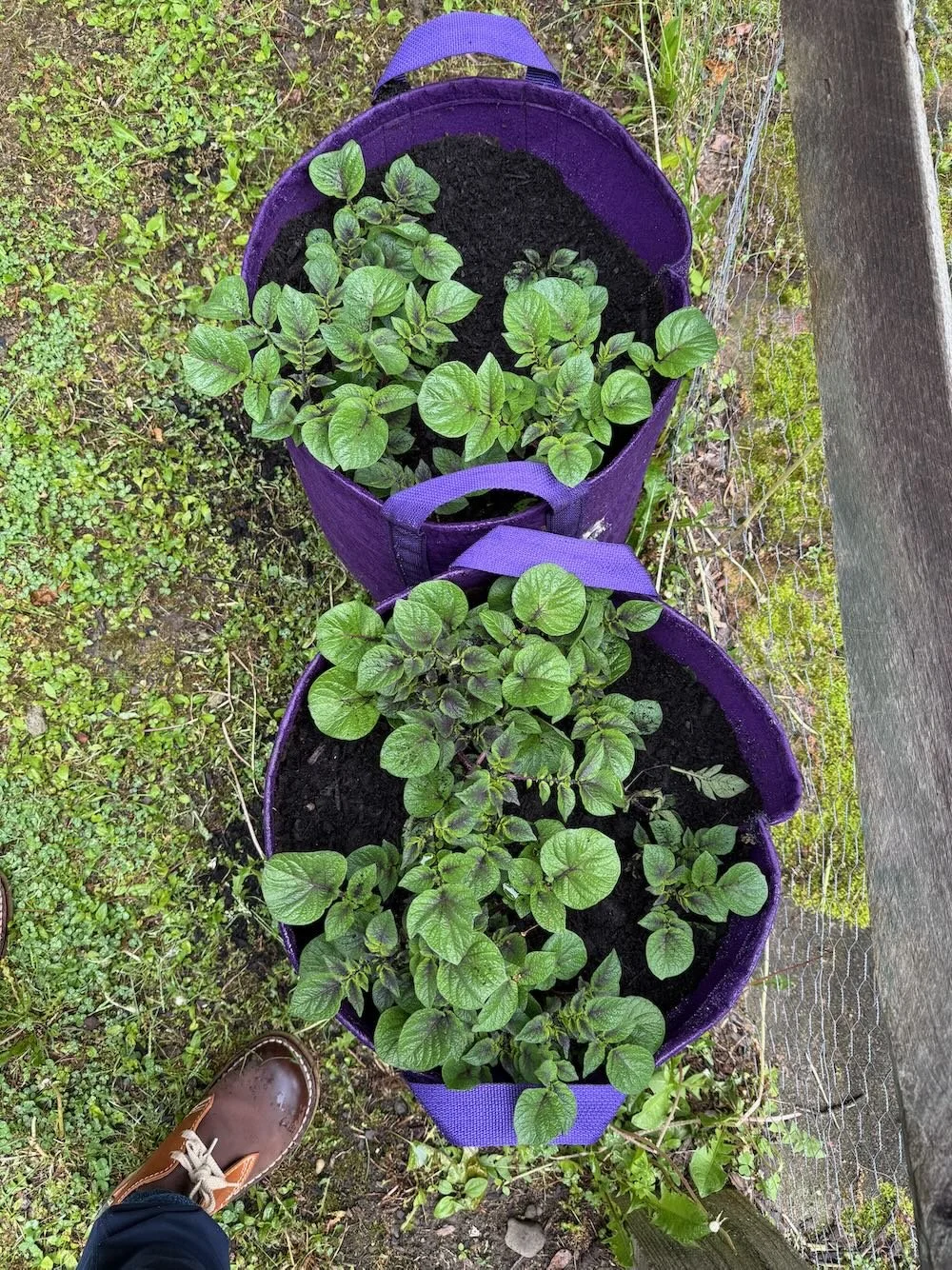 The Blackberry Potatoes have shown amazingly quick growth. They went from some modest sprouts to filling up the grow bags. The bags are filled to the brim with soil that was layered in as the sprouts grew.