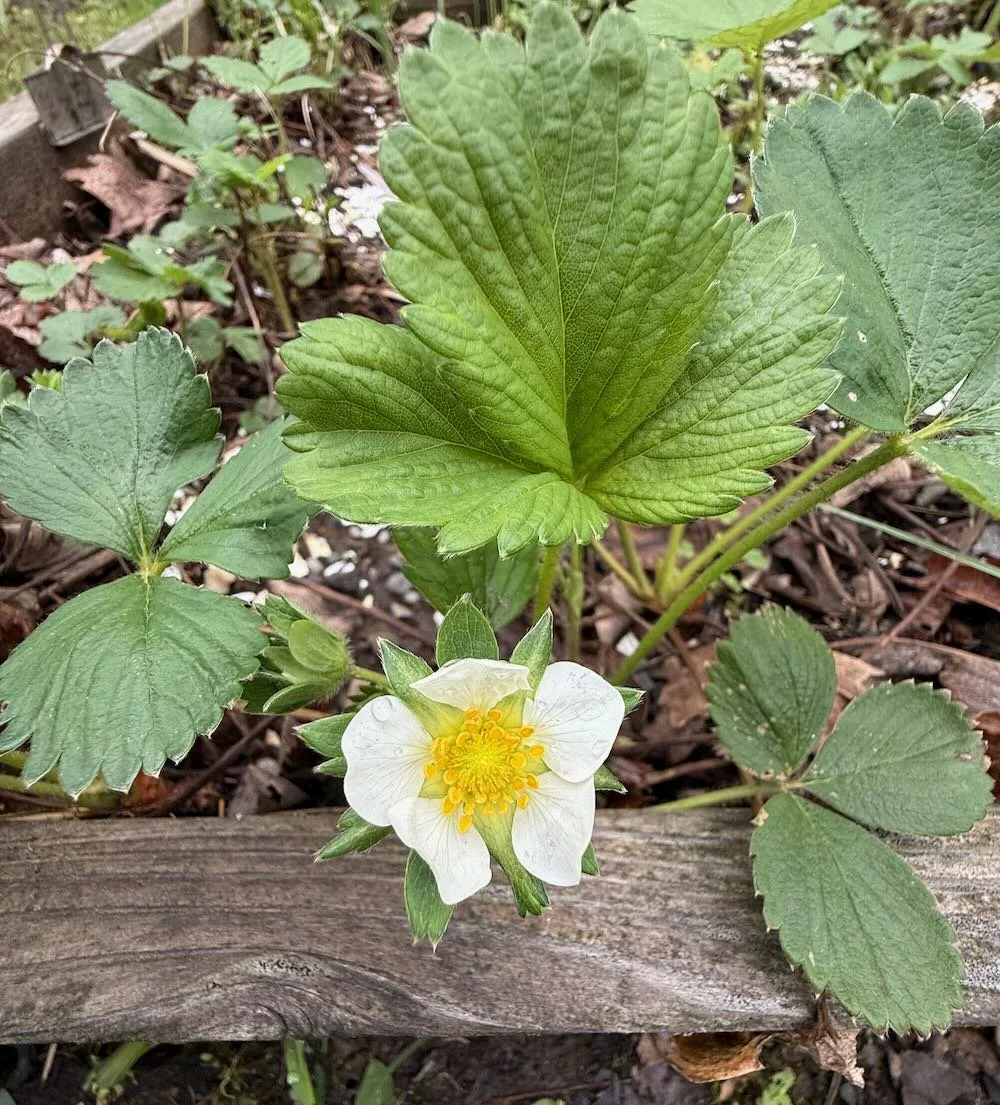 We have one garden bed for strawberries. The bed was covered with leaves during the winter, and I think that gave the plants a head start for this year because they are already flowering and berries are starting to form.