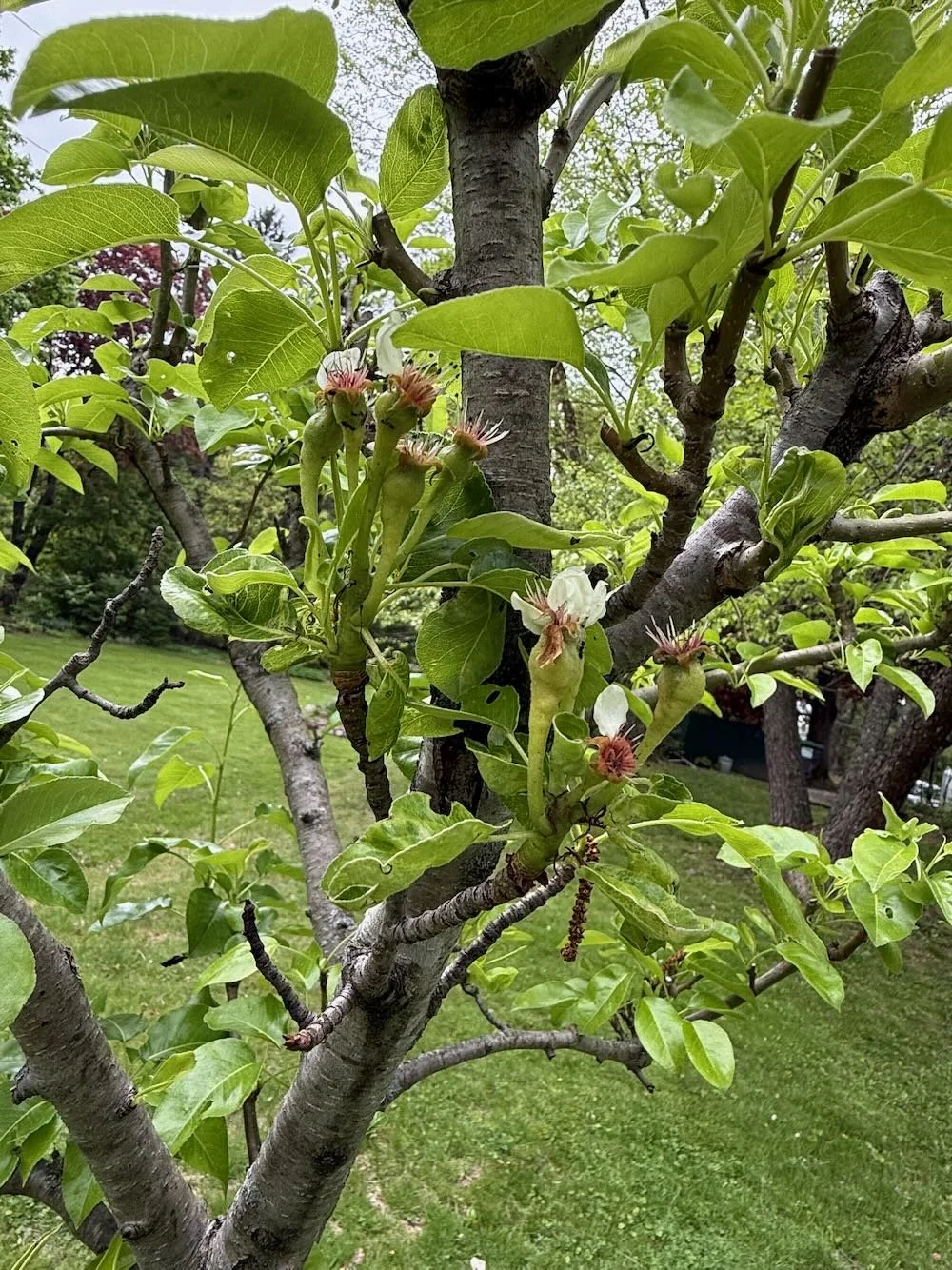 There are pears forming on the two trees on the front lawn of the main inn. The trees have been there for quite a while, but we have yet to get more than one or two mature fruits. This is probably because I’ve kept the trees at a reasonable height to make reaching for the pears easy, but unfortunately this also keeps them in reach of hungry deer.