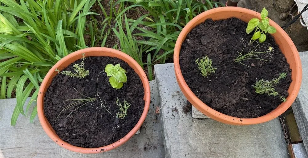 Besides planting some herbs in the garden, I got some pots to put on the steps leading up to the backdoor of the main inn and the kitchen door. The idea being easy access to fresh herbs from the kitchen and a decorative and fragrant accent on the steps.