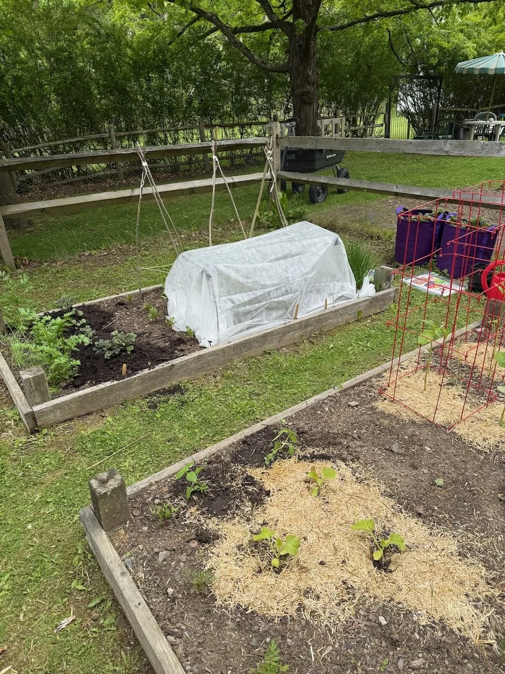 Last year our kale plants were attacked by chewing bugs almost the second they were planted out in the garden. So, this year I rigged up a row cover with sticks and a light garden fabric. It’s not the most elegant of designs or one that will be easy to get into for harvesting, but it will do for now while I think of a better system that I can build with materials at hand.