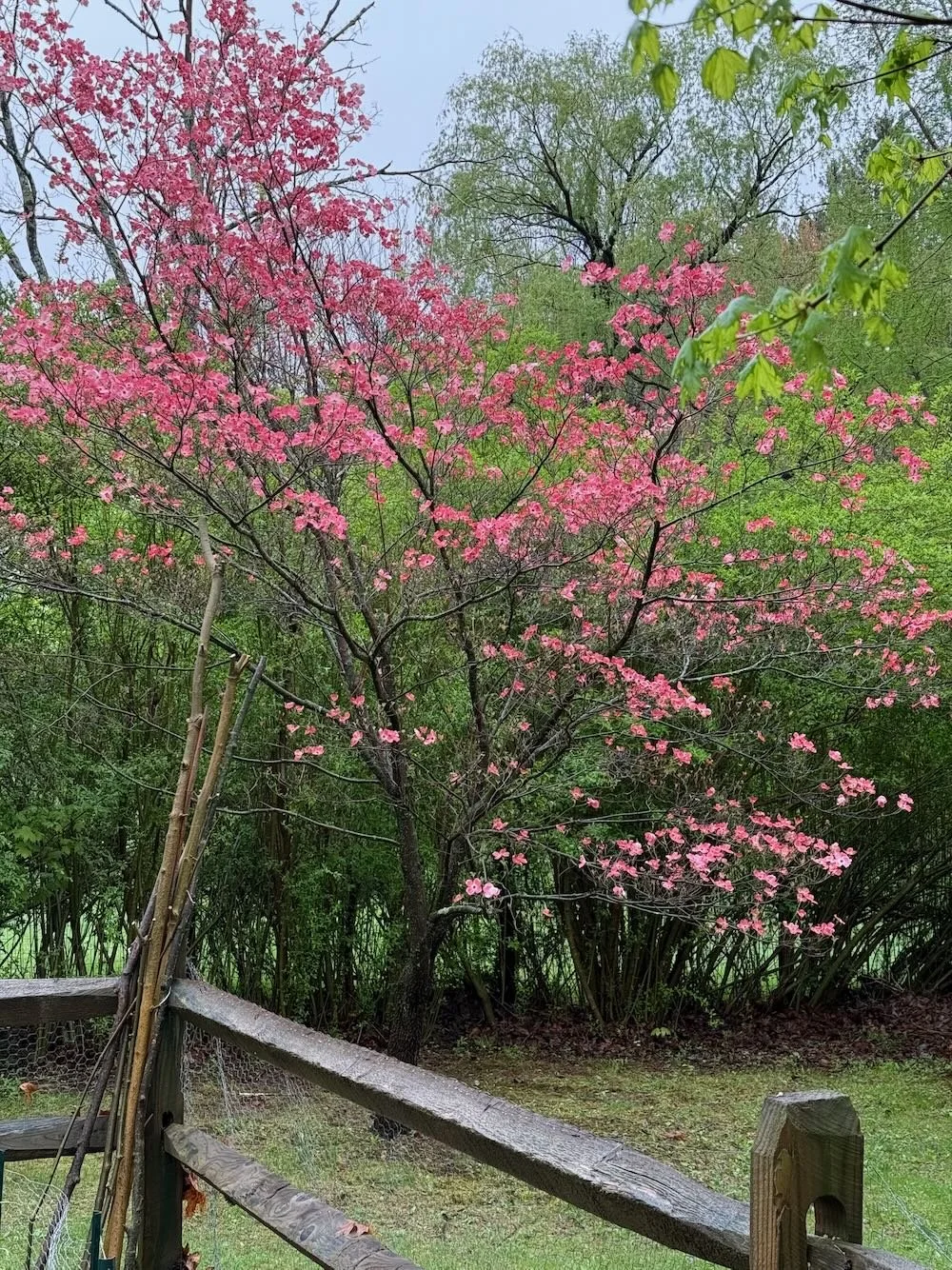 The first of the dogwood trees is presenting its annual show. This is a Cherokee Chief Dogwood. It was planted sometime in 2005. It was planted in memory of several of the Dalmatians that have graced my life. I like to plant trees as memorials for the dogs I’ve had. Sometimes it takes several years before it comes to me the type of tree that best represents the particular dog because this tree was planted for dogs I had in the 1970s up to the 1990s. I had had a dogwood on my mind as a possible tree for a while, but because during those years I lived in California and dogwoods don’t particularly thrive in zone 9, I waited until I lived in a more appropriate zone. We currently have four dogwood trees.