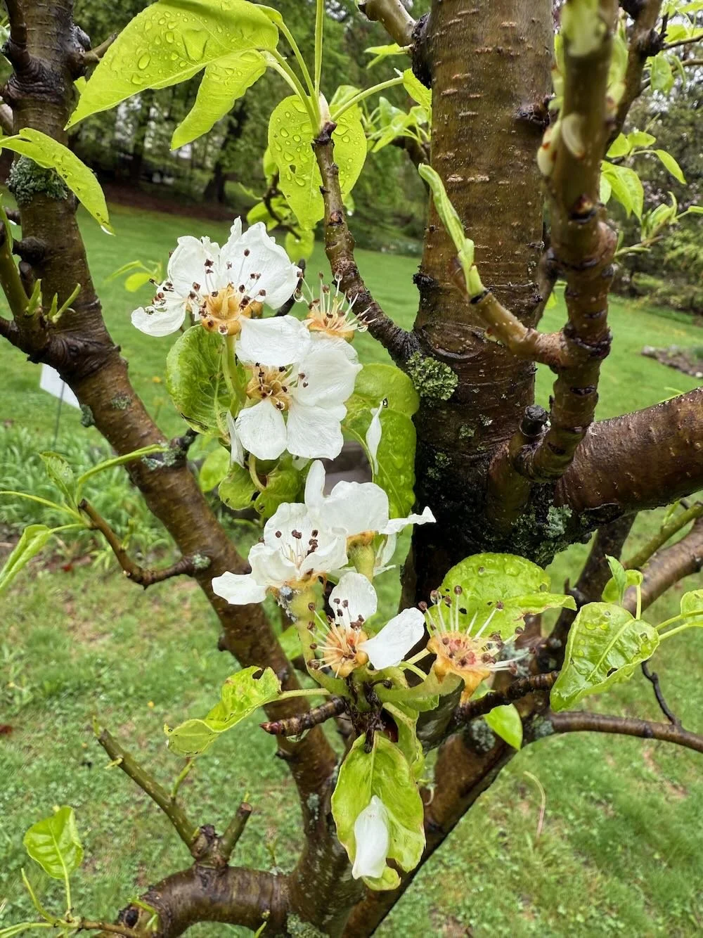 Meanwhile outside things are popping out all over the gardens as the plants drink in the fresh Spring rains and bask in the occasional glow of the sun peeking out between the clouds. We have a nice set of flowers on the Comice Pear tree this year, perhaps we will actually get a pear or two, although I’m not sure that these blossoms are above deer range, so we’ll have to see.